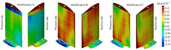 The 3D noncontact optical scanning system GOM ATOS Core was applied to assess the airfoil shape deviation. Measurement data from this system formed the foundation of three-dimensional quality control of the finished model. Based on them, we calculated the deviation of the actual size of the airfoil profile relative to the original STL file format. As a result, the maximum standard deviation of form for all types of profiles was approximately (Figure 2). Note a rough error during printing of the product A, fortunately far from the measurement height.