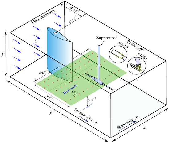 Scheme of the experimental investigation. The arrows in blue indicate the direction of air flow. The green plane represents the measuring fields for the hot wire. In the figure, and represent the width and length of the measuring fields, respectively. and represent a step between measuring points in the spanwise direction and the height of the location of the measuring field, respectively. Whereas, and are the coordinates of the location of the aerodynamic center of the airfoil. The arrows in blue indicate the direction of air flow. The red dotted lines are a set of measuring points behind the airfoil at different cross-sections.