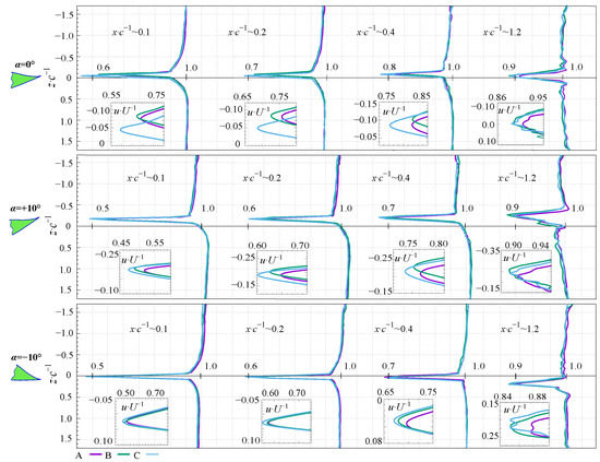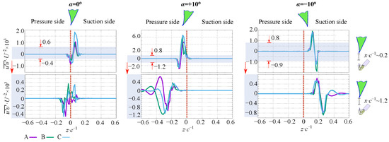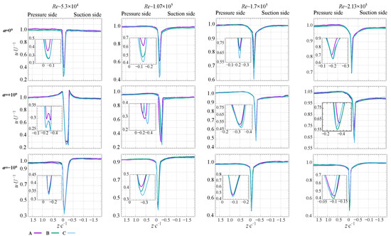 In addition, we investigated the effect of airfoil shape inaccuracies on the wake evolution at increasing distances from the trailing edge. As shown in Figure 6, the wake depth reduces with increasing distance, while the wake width grows as the wake gradually wastes. At the same time, the wake center at and shifts to the pressure side while at , it is the contrary. Meanwhile, the absent airfoil shape error leads to a growing velocity deficit. Accordingly, at each measuring cross-section behind the airfoil, the velocity curve for C has a deeper wake than for A and B modifications. In particular, this pattern is clearly visible at zero angle of attack.