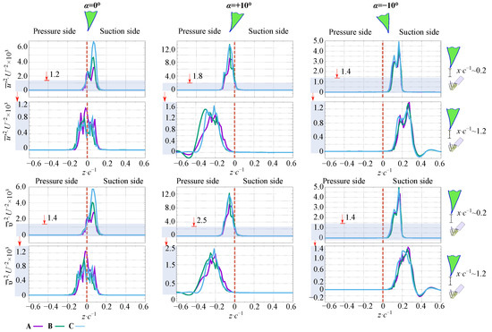 Effect of airfoil shape inaccuracies on the Reynolds shear stress distribution at different angles of attack and measuring positions . Whereas, A, B, C are NACA 64-618 airfoil modifications, which characterize a certain type of manufacturing inaccuracies. The flow velocity corresponds to The blue area shows the scale ratio of the obtained data. The red dashed line is located relative to the aerodynamic center of the airfoil.