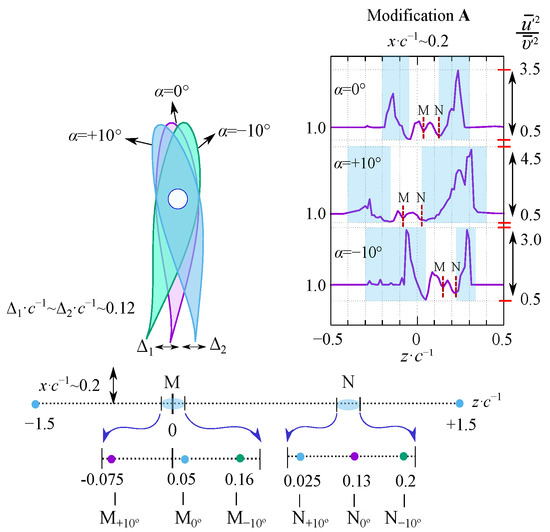 To spectrally estimate the structure of the turbulent flow, we chose two measurement points, M and N. Accordingly, the first of them is located clearly at the local minimum of the longitudinal velocity component, while the second one is placed on the beginning of the shear layer. The Reynolds number was . It is clear that at different angles of attack, the coordinates of the measuring points M and N will be changed (see Figure 10).
