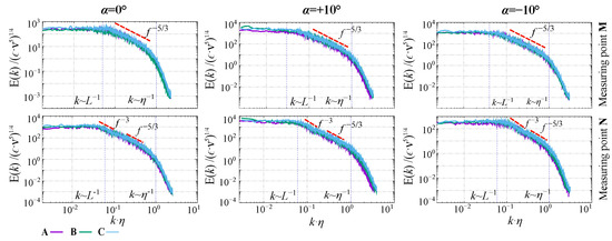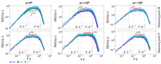 In addition, the dissipation spectrum for the points M and N was evaluated (Figure 12). The dissipation occurs at a high wavenumber, where the smallest vortices dissipate turbulent energy due to viscosity. The magnitude of this phenomenon can be estimated by Formula (2).