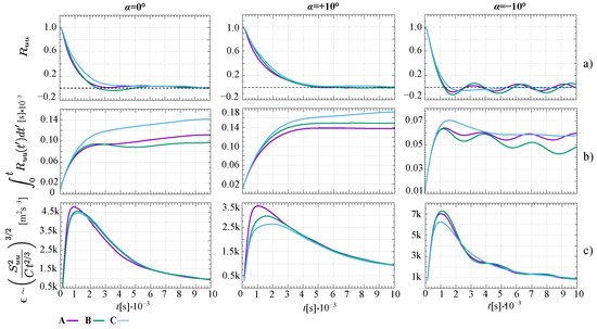 The correlation analysis of time provides a lot of useful information about the mean temporal and spatial scales of turbulent flows [56,57]. Based on the methodology [58], the auto-correlation function can be estimated by