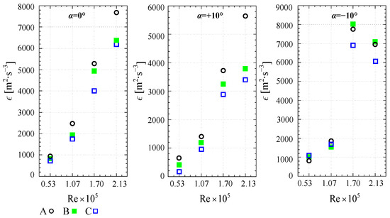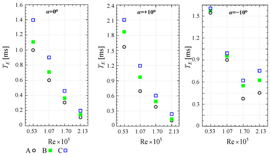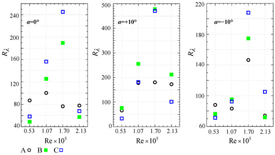To estimate the structure of turbulence (only in the streamwise direction), we chose the measurement point M. It was located by coordinates , and from to . For these calculation, depended on the angle of attack, according to Figure 10. The experimental Reynolds numbers ranged from to .