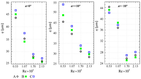 As expected, the obtained results showed a significant effect of the Reynolds number and the angle of attack on the wake characteristics. In particular, as the Reynolds number grows, the depth of the wake increases. The wake width strongly depends on the angle of attack and is the largest at . As we can see from Figure 5, the largest and smallest wake velocity deficits are characteristic at the C and A modifications, respectively. Moreover, at zero angle of attack, the difference between them is almost . It is caused by that modification A, in contrast to C, has a 4 times greater surface roughness, shorter chord length, and thicker trailing edge. Thus, according to the experimental data at , when the Reynolds number increases to ≈, the wake velocity deficit behind C modification at , and increases by , and times, respectively.