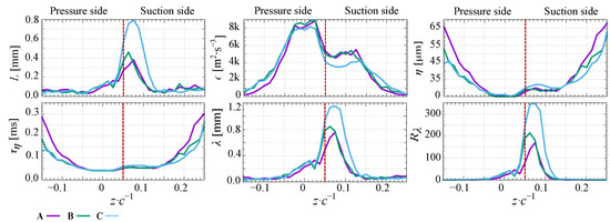 In addition, the obtained distributions show the logical regularity of the vortex scales location relative to the sides of the airfoil. Namely, the integral length scale , in contrast to the Kolmogorov scale , is located on the suction side. This is clear because from the pressure side occurs the formation of a significant number of small vortices. That leads to a significant increase in dissipation energy .