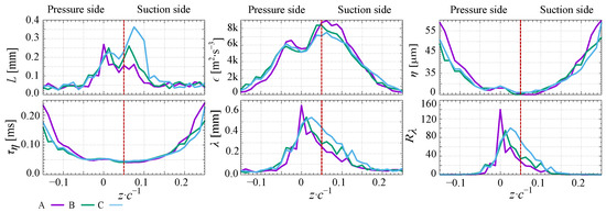 In addition, we also analyzed the effect of airfoil shape inaccuracies on the Reynolds shear stress distributions (Figure 8). Physically, this component is related to the diffusion mechanism for the transport of fluid momentum. Moreover, using the distribution, it is possible to clearly define the region of flow instability where the turbulence structure is anisotropic.