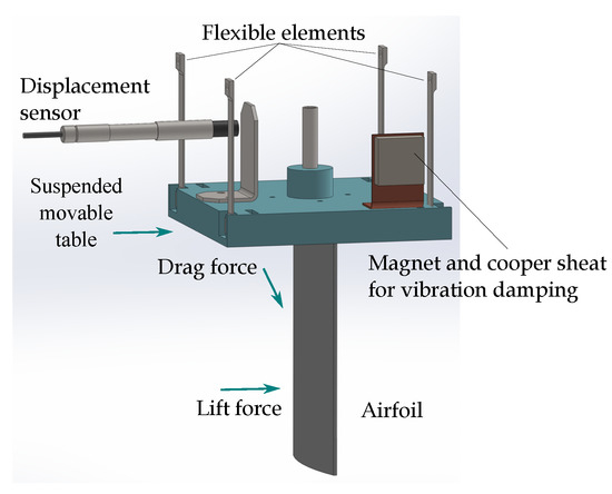 The main structural parts of the balance are a resiliently suspended movable table and an eddy current sensor. Meanwhile, the elastic suspension consists of four parallel flexible elements, which have the lowest stiffness in the lift direction of lifting force. The displacement of the table is measured by an eddy current sensor which responds to the distance to the steel target. Unwanted vibrations are dampened by eddy currents in the copper sheet as it moves near to the neodymium super magnet. The sensor output is calibrated by a known force created by using a calibration weight in the lift or drag direction. It should be noted that the measurement error of this device was approximately 1.2%. This error was caused by unwanted airfoil oscillations and to shifting of “zero position” due to low stiffness of the construction parts made of plastic. The uncertainty of the displacement sensor is expected to play a smaller role.