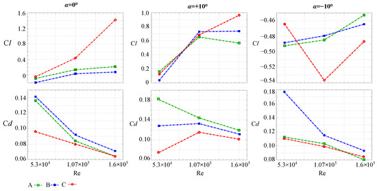 As expected, the results obtained show that lift characteristics of the airfoil are higher for the best shape configuration. It is especially noticeable at the high Reynolds numbers. For example, at and the value of for C is 7 times higher than for A and B modifications with rough surface and blunt trailing edge. In addition, the measurements revealed that regardless of the type of airfoil shape error at , the values of the lift coefficients are negative. This phenomenon is not new and is typical at low angles of attack [61]. According to the authors of [62], the shape of the separated region, along with the differential growth of boundary layer displacement thickness on the upper and lower surfaces together, introduces an effective negative camber, resulting in a negative circulation around the aerofoil, thereby generating a negative lift.