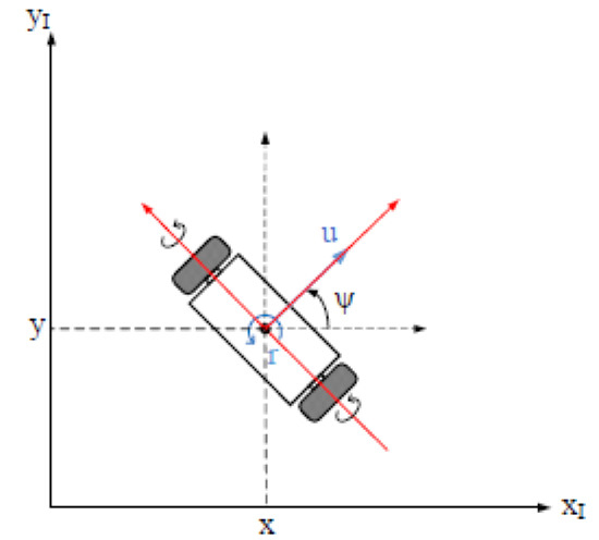 The high-torque DC electric motors drive the wheels in such a way that the TWR moves with linear velocity ‘u’ and angular velocity ‘r’ because of the difference in the rotational speed of the two DC motors. The state equations for the system are represented by Equations (2)–(4):