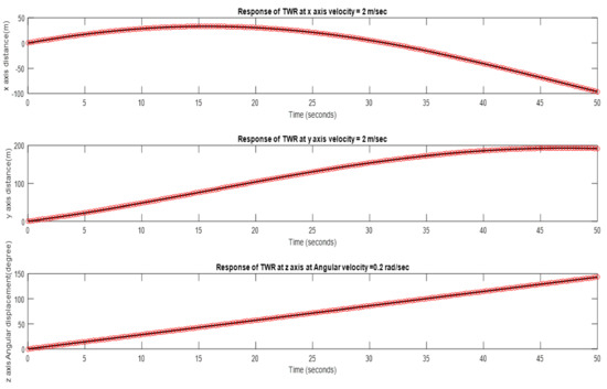 The two DC motors are operated in the two wheels of the TWR, and the rotation of these motors covered the linear displacement of the x and y axes. Moreover, the angular velocity is apart from x, y coordinates, and thus angular rotation is considered at the z axis with z displacement equal to zero. These are the three manipulated inputs of the TWR used for generating the datasets. The obtained datasets from 12 different operating conditions provided the testbed for estimation of the nonlinear dynamics of the TWR. The sampling time period is 0.25 s for the nonlinear kinematics of the TWR. All the datasets are obtained using the Matlab command ‘iddata’ and combined using the ‘merge’ command. The merged dataset is used for estimating the dynamics of the TWR. The NLARX structure is heuristically selected to provide maximum fit for the estimation of 12 operating conditions, as shown in Table 1. The NLARX model is estimated using the Matlab ‘nlarx’ command. This model is validated at two different operating conditions. In the first dataset, the two DC motor velocities are equal to 2 m/s and angular velocity is equal to 0.05 rad/s. In the second dataset, the two DC motor velocities are equal to 4 m/s and angular velocity is equal to 0.8 rad/s. The obtained datasets are considered as validation datasets.