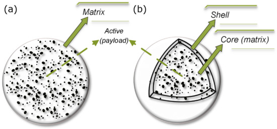 The encapsulation process involves the entrapment of active substances into another substance wall material that produces particles on various scales [233,234,235]. In general, there are two main forms and structures (morphology) of encapsulation system: matrix type (spheres) and core-shell type (capsules) (Figure 1) [236]. The substance that is encapsulated is usually labeled as the core, fill, active, internal, or payload phase, while the wall material used for the encapsulation is labeled as coating membrane, shell, capsule, carrier material, external phase, or matrix [233,237,238].