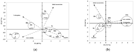 Principal component analysis (PCA) showing the two first axes (axes F1 and F2 of total variance) for the PAH distribution. (a): BA4 treatment; (b): NA treatment. The PCA was performed on four PAH parameters: % dissipation, PAH initial concentration, water solubility, and Log Kow. For PAH abbreviations, see Table 3. Only PAH types with significant dissipation are shown.