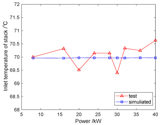 To verify the accuracy of the Simulink model of the fuel-cell cooling system, it is necessary to measure the current and temperature online [17], and the parameters of each component in the experiment are the parameters used in the modeling of the simulation research. The actual test was carried out according to the working principle of the cooling system. A temperature sensor was set at the cooling water inlet and outlet of the fuel cell. Through the monitoring of the temperature, the opening of the radiator was determined [18], so that the temperature of the cooling circulating water outlet was stabilized at about 70 °C. When the fuel cell is in steady-state operating conditions of 8 kW, 16 kW, 20 kW, 24 kW, 28 kW, 30 kW, 32 kW, 36 kW and 40 kW, feed-forward control is carried out on the water pump and PID control is carried out on the radiator, to obtain the inlet coolant temperature under this control strategy. The experimental data are processed and compared with the results obtained by software simulation, as shown in Figure 4 below.