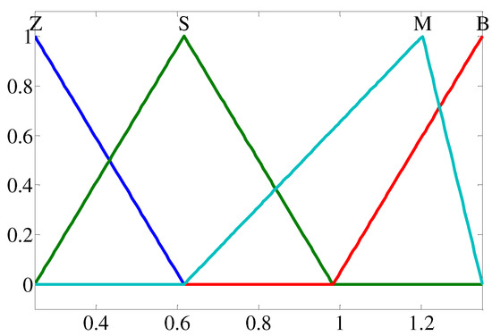 Considering the properties of expansion factors, the fuzzy universe of output is divided into four fuzzy subsets—{Z, S, M, B}—in which the membership functions of expansion factors α1 and α2 are trigonometric functions, and the non-uniform trigonometric functions can achieve better control effect, while ensuring that the independent variables will not exceed the original range after changing, adjust the trigonometric functions, and the abscissa of the peak points of membership functions are {0.25, 0.62, 1.2, 1.35}, respectively. However, the membership function of β is not out of range, and uniformly distributed trigonometric functions are adopted. The abscissa of the peak points of the membership function are {0.5, 0.67, 0.83, 1}, as shown in Figure 7 and Figure 8.