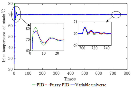 Some scholars have made many attempts at a temperature control strategy, such as the flow-following current-control strategy [6], adaptive control strategy [7,8], neural network active disturbance rejection control strategy [9], control strategy of compensation through active disturbance rejection control [10], real-time power optimization strategy of active temperature control [11], and fuzzy control strategy [12]. Among them, fuzzy control is established based on expert knowledge and practical experience, which has low dependence on the controlled model, simple structure, and good robustness [13], and is frequently used in the temperature control system of a fuel cell [14,15]. The control accuracy of fuzzy control is guaranteed by fuzzy rules, but the number of fuzzy rules is limited [16]. To improve the steady-state accuracy, this paper adopts the variable-universe fuzzy PID controller. The fuzzy universe is adjusted by the dilation factor, and the number of fuzzy rules is locally increased to improve the use rate of fuzzy rules, to achieve a better control effect.
