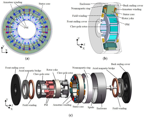 The configuration of the proposed HE-CPM is shown in Figure 1. The generator mainly consists of the stator core, claw-pole rotor, nonmagnetic ring, front and back ending covers and enclosure. The stator core is formed by axial lamination of silicon steel sheets, twelve armature coils are wounded in stator slots, and the current polarities are shown by blue dots and crosses in Figure 1a. The rotor part is composed of two mutually nested claw-pole rotors, PMs and rotor yoke, as shown in Figure 1b,c. PMs are inserted in the two claw-pole rotors, and the magnetization directions of PMs are shown by the blue arrows in Figure 1a. The rotor yoke is sleeved on the two mutually nested claw-pole rotors. Two field windings are placed in front and back ending covers, respectively, and they are connected in series.
