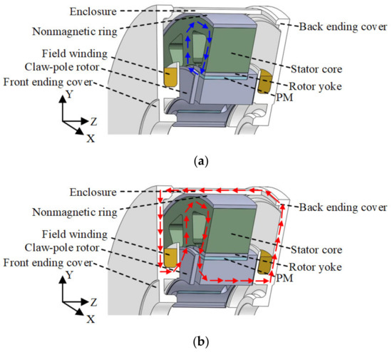 Hybrid flux path in HE-CPM. (a) PM excitation flux path. (b) Field excitation flux path.