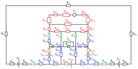 The closed-loop MEC under a pair of magnetic poles at the initial rotor position is modeled, as shown in Figure 3. The stator-related items are marked in red. The rotor-related items are marked in blue. The PM-related items are marked in gray, including PM equivalent internal reluctance and PM equivalent magnetomotive force (MMF) source. The air gap-related items are marked in cyan. Different items in MEC are listed in Table 1.