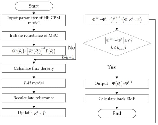 The flow chart of 3D MEC is shown in Figure 5. According to Figure 3 and Equations (4)–(8), the initial reluctance matrix can be calculated. Then, the flux of the initial position can be obtained from (13). Perform iterative calculation according to (14), and update , when the rotor moves to the next position. When the difference between and is within the allowable range, the solution of rotor position is obtained. With the change of rotor position, and will change accordingly. Therefore, the proposed MEC is a 3D MEC that is related to the position of the rotor.