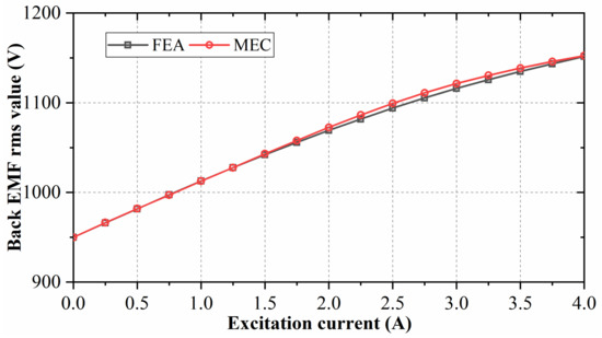 The no-load characteristic derived from FEA and the no-load characteristic calculated by using the proposed 3D MEC are compared in Figure 6. With the increase of excitation current, the back EMF also increases. A good agreement between both characteristics can clearly be noticed. By changing the excitation current, the back EMF can be adjusted, and the generator output power can be modulated.