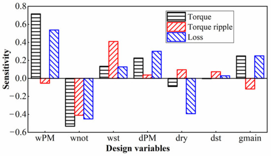 Therefore, the sensitivity of wPM, wnot, wst, dPM, dry, dst, gmain can be obtained by calculating the derivative of the objective function. The greater the value of sensitivity, the greater the influence of dimension parameters on optimization objectives. If the dimension parameter has a positive sensitivity value, it indicates that the optimization objective will increase with the increase of dimension parameter; if the design variable has a negative sensitivity value, it indicates that the optimization objective will decrease with the increase of dimension parameter.