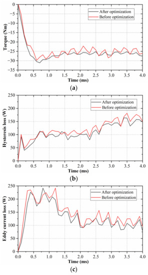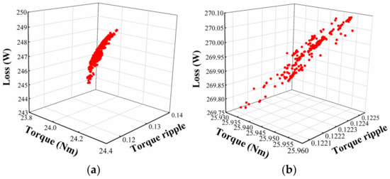 Firstly, the three design variables of level A are optimized, and the resulting Pareto solution set is shown in Figure 9a. It can be seen that the corresponding torque is about 24 Nm and the torque ripple is 0.12 to 0.13. The loss is about 245 W. After optimizing the three design variables in level A, the two design variables of level B are optimized, and the resulting Pareto solution set is shown in Figure 9b. It can be seen that the torque increases to 25.95 Nm, the torque ripple is stable at about 0.122, but the loss increases to about 270 W.