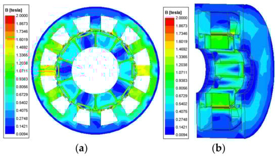 The rated power of the proposed HE-CPM is 10.28 kW, and it has the largest power of these machines. The efficiency of the proposed HE-CPM reaches 89%. The claw pole generator reported in [11] has a rated power of 7.2 kW and an efficiency of 92%. However, one issue of this design is the complex stator structure, which leads to difficultly in manufacturing. The hybrid excited claw pole machine reported in [17] has a configuration similar to the proposed HE-CPM, its PMs are mounted on the rotor, and the field winding is embedded within machine shields. However, its rated power is too low due to a small machine size. The claw pole electric machine reported in [25] has an efficiency of 81%, but its rated power is unknown. The relatively large cogging torque in this design is a significant problem. The hybrid excitation claw pole generator reported in [26] has a rated power of 0.65 kW, while its efficiency is unknown. The rated power is too low to be used in large EVs. The hybrid excitation claw pole machine reported in [27] has a decent performance. It has the same rated speed (3000 rpm) as the proposed HE-CPM and the rated power is 5 kW. The usage of an iron powder core in that claw pole machine decreases the torque by about 4% but also reduces the iron losses. It should be noted that the iron powder core is more porous than solid iron. Therefore, the allowable stress of the iron powder core is 125 MPa. The allowable stress of the rotor yoke in the proposed HE-CPM is 800 MPa, which is much higher. Comparing the rated power, voltage, speed and efficiency of these machines, the proposed HE-CPM has the highest rated power (10.28 kW), and the efficiency is about 89%, slightly lower than that of the machine reported in [11].