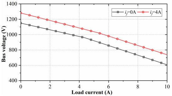 The relationship between bus voltage and the load current is shown in Figure 15. With the increase of load current, the bus voltage decreases. Increasing the excitation current from 0 A to 4 A can significantly increase the bus voltage.