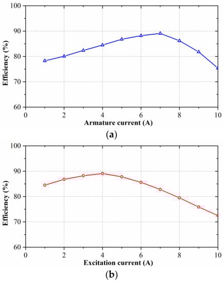 The relationship between efficiency and armature current and the excitation current is shown in Figure 16. It can be seen that with the increase of current, the efficiency first increases and then decreases. The rapid increase of copper loss is the main reason for the decrease in efficiency. The maximum machine efficiency is 89%.