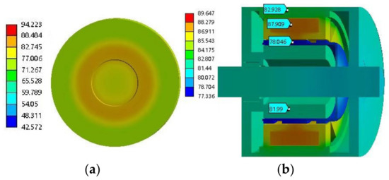 It can be seen from Figure 17, Figure 18 and Figure 19 that the maximum operating temperature of field winding is 87.909 degrees centigrade. The field winding consists of copper wires. Based on (25), the copper resistivity at temperature 87.909 degrees centigrade can be calculated, and . It can be seen from (24) that the copper loss is proportional to . Therefore, the copper loss at 87.909 degrees centigrade is 1.267 times that of the copper loss at 20 degrees centigrade. The lower the temperature, the smaller the copper loss. It can be seen from (27) that the efficiency is improved when the copper loss is reduced. Therefore, the maximum operating temperature of the machine should be as low as possible.