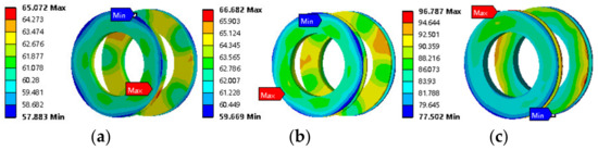 Temperature field nephogram of axial magnetic bridges. (a) If = 1 A. (b) If = 2 A. (c) If = 4 A.