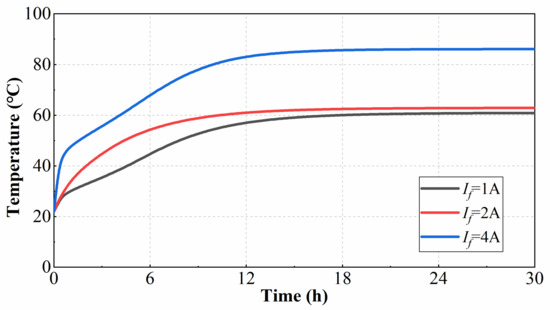 The temperature of each part of HE-CPM needs to be analyzed to ensure that the temperature is within the allowable range when the generator is working. The temperature of each part of the machine should not exceed 90 degrees centigrade. The temperature field nephogram of HE-CPM is shown in Figure 17. It can be seen that the maximum temperature is 87.909 degrees centigrade, and the position is the field winding which is placed in the axial magnetic bridge. When the excitation current increases, the temperature of the axial magnetic bridge will rise, so the temperature of the axial magnetic bridge at different excitation currents is shown in Figure 18. It can be seen that when the excitation current increases from 1 A to 4 A, the temperature increases from 60.6 degrees centigrade to 87.909 degrees centigrade. The temperature curve of the axial magnetic bridge is shown in Figure 19.