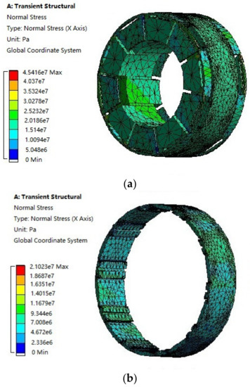 Mechanical stress nephogram of HE-CPM. (a) Rotor. (b) Rotor yoke.