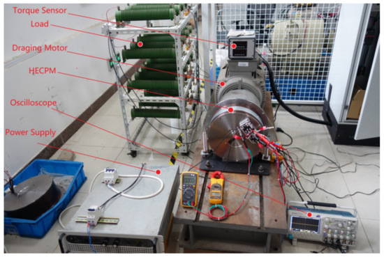 The prototype of the proposed HE-CPM was manufactured and shown in Figure 21a,b, and its dimension parameters are listed in Table 7. The experimental test bench is shown in Figure 22. A torque sensor is used to measure the electromagnetic torque, and the oscilloscope is used to display the measured waveforms.