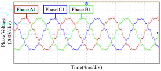 The experimental back EMF waveform of the proposed HE-CPM is shown in Figure 23 and it is nearly sinusoidal. It can be seen from Figure 24, with the increase of excitation current, the DC bus voltage also increases. When the excitation current is 4 A, the curve of DC bus voltage becomes flat, and the DC bus voltage is stable at about 1250 V. It can be seen from Figure 25 the DC bus voltage decreases with the increase of load current. When the excitation current changes from 0 A to 4 A, the DC bus voltage increases by about 135 V. Obviously, increasing the excitation current can increase the voltage and also the output power. The experimental results are basically consistent with the FEA results. When the excitation current is 4 A, the rated torque under rated speed (3000 rpm) can be measured by the torque sensor and its value is 32.72 Nm. The rated power can be calculated by (26), and its value is 10.28 kW. The rated voltage under rated speed (3000 rpm) is measured and its value is 543.1 V. The rated parameters of HE-CPM are listed in Table 8.