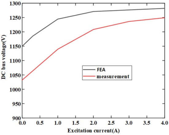 Comparison results of DC bus voltage versus excitation current between FEA and experimental measurement.