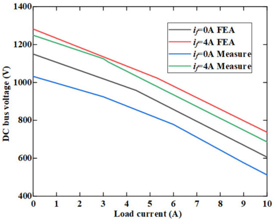 Comparison results of DC bus voltage versus load current between FEA and experimental measurement.