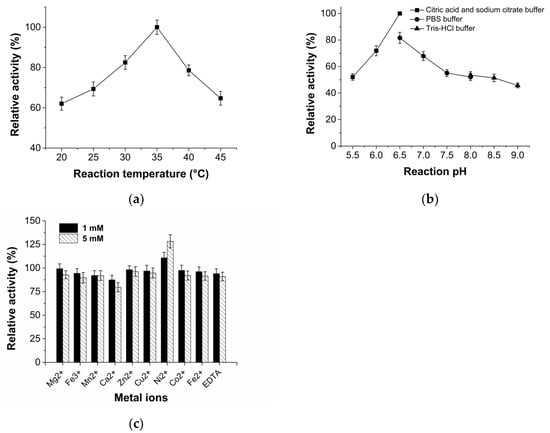 (a) Enzyme activities at different temperature levels. (b) Enzyme activities at different pH levels. (c) Enzyme activities after extra (1 or 5 mM) metal ions or EDTA addition. The specific activity of purified enzyme equal to 100% was 3.18 U mg−1 protein.