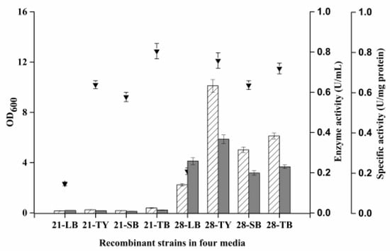 Two recombinant strains (E. coli BL21(DE3)/pET-28a+NHase and E. coli BL21(DE3)/pET-21a+NHase) were constructed in this lab. The effect of plasmids on enzyme production was studied in four basic media (Figure 5). Much higher total activity and specific activity were obtained with recombinant strain E. coli BL21(DE3)/pET-28a+NHase. This could be mainly ascribed to the higher expression level of target protein with E. coli BL21(DE3)/pET-28a+NHase (Figure S1). The best medium for E. coli strain BL21(DE3)/pET-28a+NHase is TY, in which OD600, enzyme activity and specific activity were 12.12, 0.63 U/mL and 0.37 U/mg protein, respectively, much higher than the 3.31, 0.14 U/mL and 0.26 U/mg protein obtained with LB medium. High-level production of recombinant protein was deemed a metabolic stress for host cells. TB or TY media rich in essential nutrients that could support cell growth and protein production were more favorable for recombinant protein expression compared with LB [,,].