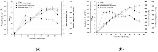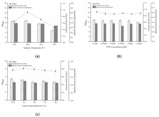 When higher induction temperatures (>20 °C) were employed, cell growth was inhibited. A lower induction temperature (15 °C) was favorable for recombinant protein production in view of higher specific activity but detrimental to biomass accumulation. So, the best induction temperature was 20 °C (Figure 6a). IPTG concentration had no significant effect on cell growth and protein production (Figure 6b). The change of IPTG to lactose had negative effects on bacterial growth, enzyme activity and specific activity (Figure 6c). This was different from our previous reports, in which lactose worked well for recombinant enzyme production [,,], which suggested that the culture conditions are strain- or gene-specific to some extent. Lactose could be utilized as a carbon source as well as an inducer; excessive carbon sources might reduce the culture pH and slow down cell growth [,,]. So, a relatively low concentration of IPTG (0.1 mM) was employed in the following experiments in view of process cost.