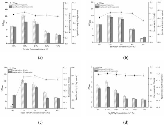 Effect of medium components concentration on cell growth and enzyme activity. (a) Effect of sorbitol. (b)Effect of tryptone. (c) Effect of Oxoid yeast extract. (d) Effect of Na2HPO4.