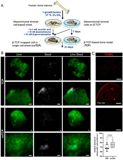 To enhance the handling, reproducibility, and quality of β-TCP-based cancellous bone models, we used a technique known as cell-sheet technology. We used bone-marrow-derived MSCs obtained from patients undergoing surgery for total hip replacement as a cell source. MSCs were seeded at a high density onto a temperature-responsive cell culture surface and in parallel on biodegradable β-TCP scaffolds (Figure 1A). The cell-sheet reached confluence within 2 or 3 days and formed a thin cellular sheet at 7 days. To investigate the survival of differentiated MSCs in 3D, LIVE/DEAD® and TUNEL staining was performed on day 21. Results indicated a higher survival rate—relative area of living (Calcein-AM+) cells—of osteogenically induced MSCs populated on β-TCP wrapped with a single MSC-sheet (csTCP) to the unwrapped MSC-populated β-TCP (TCP; Figure 1B,C). Taken together, combining cell-sheet technology with conventional β-TCP leads to improved survival without causing apoptosis.