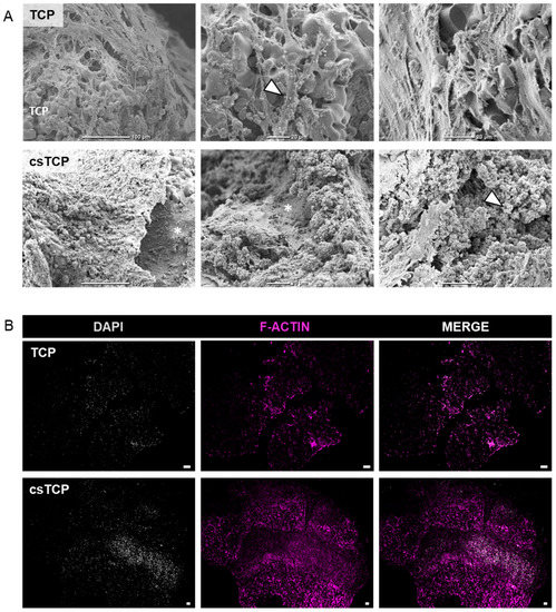 Comparing csTCPs and MSC-populated TCPs regarding cell density and morphology. (A) Exemplary SEM images at three magnifications highlighting cell adhesion, ECM content, phenotypic features at day 21 comparing TCP and csTCP. Cells well adhered to and spread on the surfaces of β-TCP. (B) Immunofluorescence staining for F-actin and DAPI to visualize cell density through the β-TCP particles. Exemplary images for n = 5. Scale bars show 100 µm. Legend: asterisk = highlighting ECM; arrow = highlighting microstructure deposition; TCP = highlighting the scaffold material.