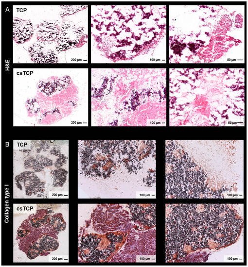 Comparing csTCPs and MSC-populated TCPs regarding uniform cell distribution and ECM at 21 days. (A) Representative images of hematoxylin and eosin (H & E) staining. (B) Exemplary images of histological sections stained for collagen type I and visualized using brightfield microscopy.
