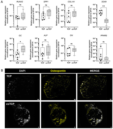In this line of observation, PPARG as an adipogenic marker gene and SOX9 as a chondrogenic marker gene tended to be expressed less and significantly less, respectively, when TCP scaffolds were combined with sheet technology (Figure 4A). We further confirmed the SPP1 gene expression result with immunofluorescence staining and noticed an intense staining of osteopontin at csTCP, as shown in Figure 4B. In summary, a clear osteogenic differentiation was achieved when using cell-sheet technology.