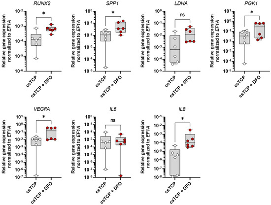 Deferoxamine (DFO) conditioned medium further promotes osteogenesis of the csTCP bone model verified on mRNA level using RT-qPCR. csTCP was treated after 21 days with 250 µM DFO for 72 h. Relative expression of RUNX2, SPP1, LDHA, PGK1, VEGFA, IL6, and IL8 was normalized to the housekeeper gene EF1A. Data are shown as box plots (centerline, median; box limits, upper and lower quartiles; whiskers, maximum and minimum values; all data points); n = 6. Statistics: Two-tailed Wilcoxon matched-pairs signed-rank test. p-values are indicated in the graphs with * p < 0.05 and ns = not significant.