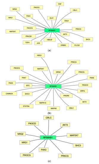 Interaction analyses among the affected genes were conducted to determine how the drug exerts systemic effects through gene interaction. Our conclusion was that RPS6KB1 is a hub gene for each 20 genes of the two datasets (Figure 2a,b) and shared 10 genes, including AKT3, CBLC, MAP2K7, NRG1/2, PAK3, PIK3CD/G, PRKCG, and SHC3, as shown in Figure 2c.