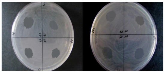 Photographs of sterilization zones on agar plates with 3 × 105 cells/cm2 bacterial density of Pseudomonas aureofaciens AP-9 at 17 W (left) and 20 W (right) wave power. The different sectors on Petri plates were treated with different durations—top-left 5 s, bottom-left 10 s, bottom-right 15 s, top-right 20 s.