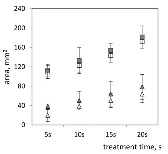 The area of sterilization zones as a function of treatment time at different wave powers (white markers—17 W; dark markers—20 W) and bacterial densities (triangle markers—90 × 105 cells/cm2; square markers—3 × 105 cells/cm2).